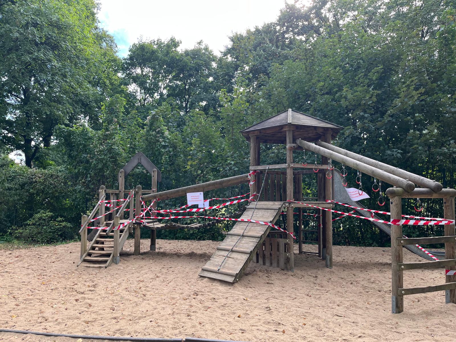Leider muss der Spielplatz ab sofort komplett gesperrt werden. Eine Überprüfung durch einen offiziellen Spielplatzprüfer hat ergeben, dass er nicht mehr den üblichen Sicherheitsstandards entspricht und zu einer Gefahr für die dort spielenden Kinder werden könnte. Aus diesem Grund sehen wir uns leider gezwungen, die Benutzung der Spielgeräte ab sofort zu untersagen. Der Sandkasten ist davon nicht betroffen.
